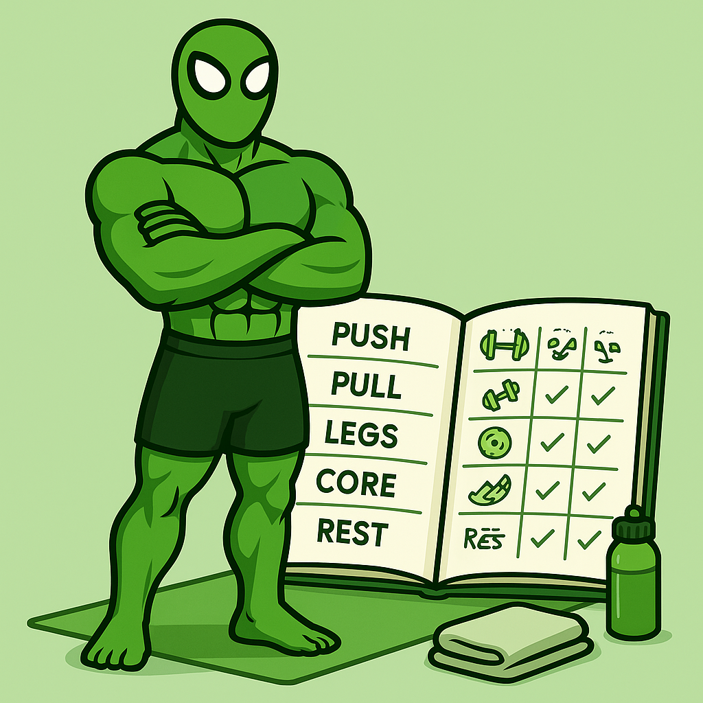 ✅ Full 7-day plan (Push, Pull, Legs, Core & Rest)